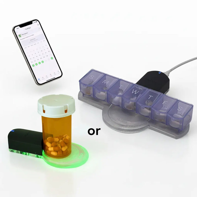 Nudge uses advanced sensors to detect when your medication bottle or organizer is moved. If it doesn't detect movement at the scheduled time, it gently reminds you with a pulsing green light, then a soft beep, and finally a phone notification after 1 hour.