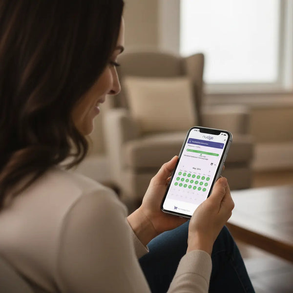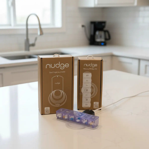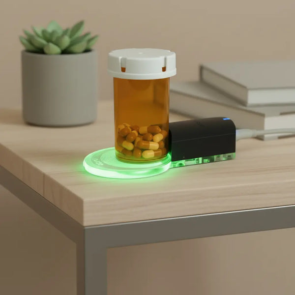 Nudge uses advanced sensors to detect when your medication bottle or organizer is moved. If it doesn't detect movement at the scheduled time, it gently reminds you with a pulsing green light, then a soft beep, and finally a phone notification after 1 hour.